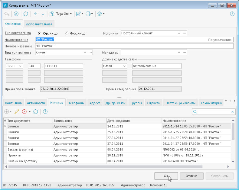 Включает в себя подразделы КОНТРАГЕНТЫ, КОНТАКНЫЕ ЛИЦА, СОБЫТИЯ. Контрагенты - справочник контрагентов, позволяет вести учет всех контрагентов, с которыми когда-либо имели взаимоотношения (Клиенты, поставщики, потенциальные клиенты …). Здесь сохраняются все реквизиты контрагентов, отрасли, группы, счета, телефоны, контактные лица, события. События - это все возможные контакты с данным контрагентом: звонки, встречи, переписка…